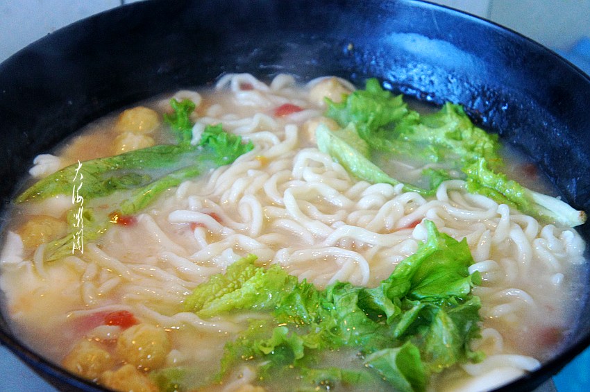 下入面条,煮三个开即可关火,然后下入生菜叶和香菜。
