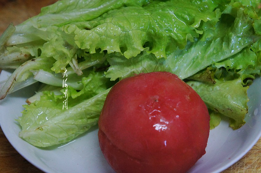 生菜、香菜、西红柿清洗干净,锅中加少许水,水开把西红柿烫一下,去掉外皮切块。