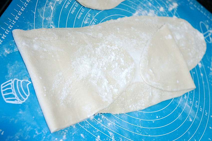 面团分成3个小面团,擀成略长一点的薄饼,塞入压面机压成面片。