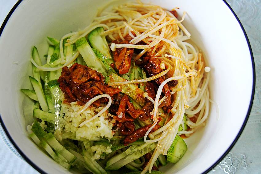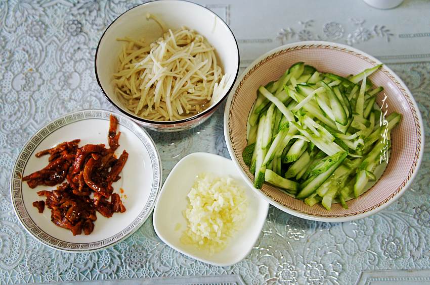清洗干净的黄瓜切丝,不用切得太细,口感不好。金针菇捞出控净水分。田园牛肚根据自己能承受的辣度加,我加两包,口感不错,香辣爽口。大蒜去皮洗净切碎,大蒜是天然的消炎药,夏天经常吃点大蒜有利于肠胃的健康,能预防肠道疾病和流感等。