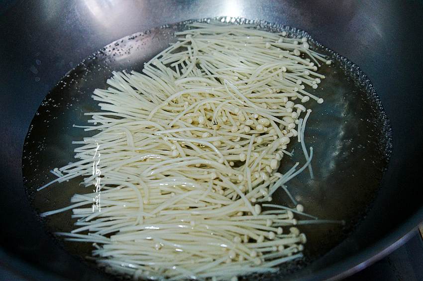 锅中加入适量的水,水开下入清洗干净的金针菇焯水,然后捞出过冷水。