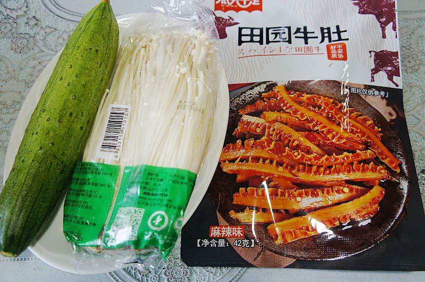 【牛肚凉拌菜】所需食材:黄瓜1根;金针菇1包;田园牛肚2包;大蒜4瓣;轻盐酱油适量;清香米醋适量;白糖少许。