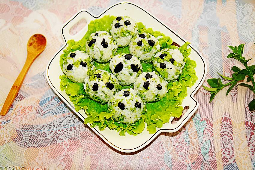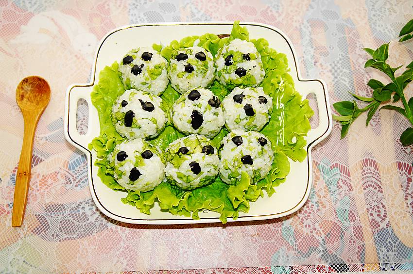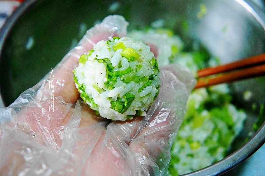 带上一次性手套,攥成自己喜欢大小适宜的饭团子。