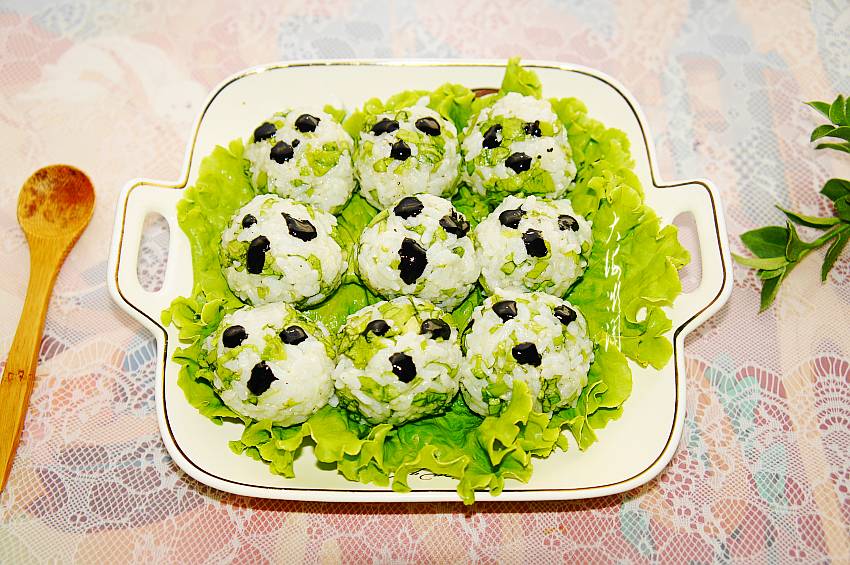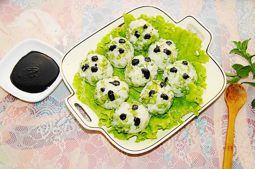 【黑芝麻酱蔬菜饭团子】所需食材:胚芽米200g;糯米100g;生菜适量;香葱适量;黑芝麻酱10g;盐适量;胡椒粉适量。