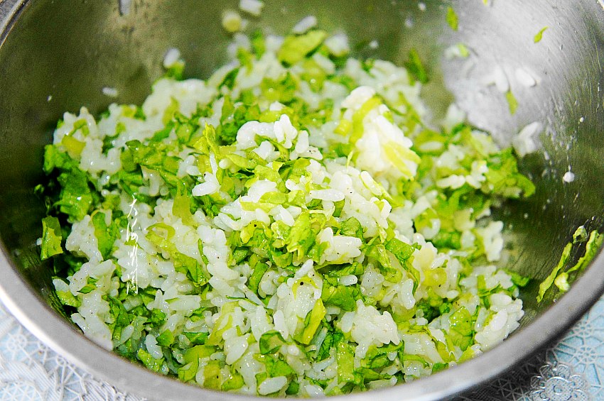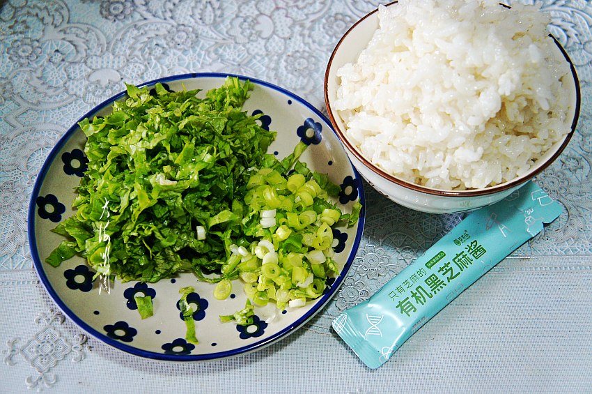 蒸好的大米饭取出,非常松软,米香浓郁。生菜叶清洗干净切碎,香葱去皮洗净切碎,有机黑芝麻酱只需一包,我喜欢这种独立包装,一次10g刚刚好。
