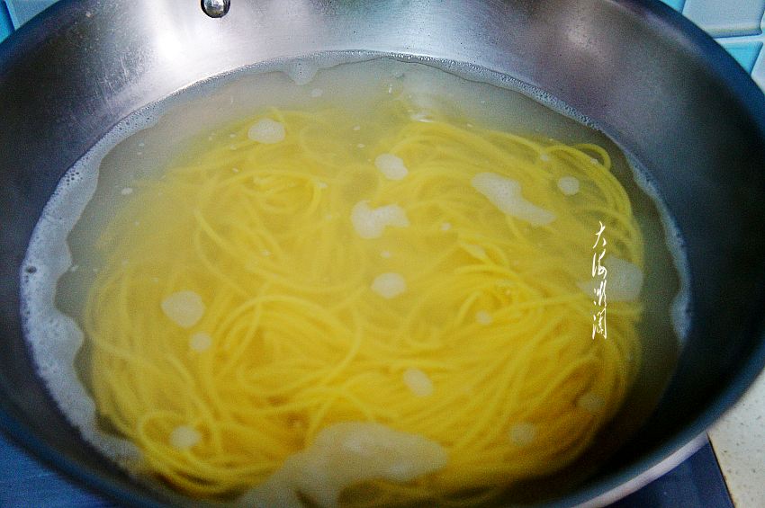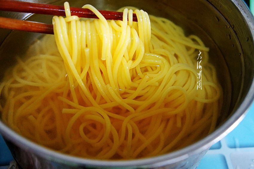 面条煮好后,捞出来,过冷水,最好用凉白开水,吃法更健康,避免生水引起肠道不适。然后捞出,控净水分。