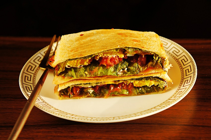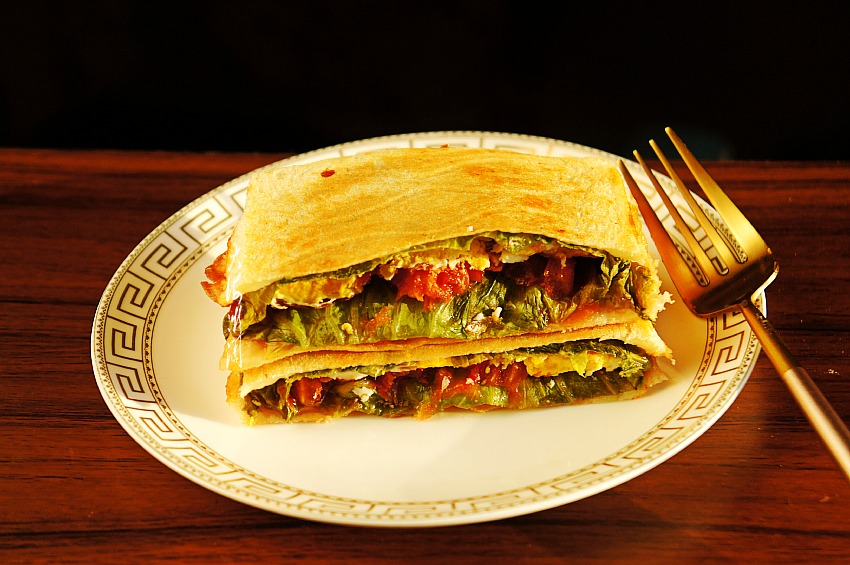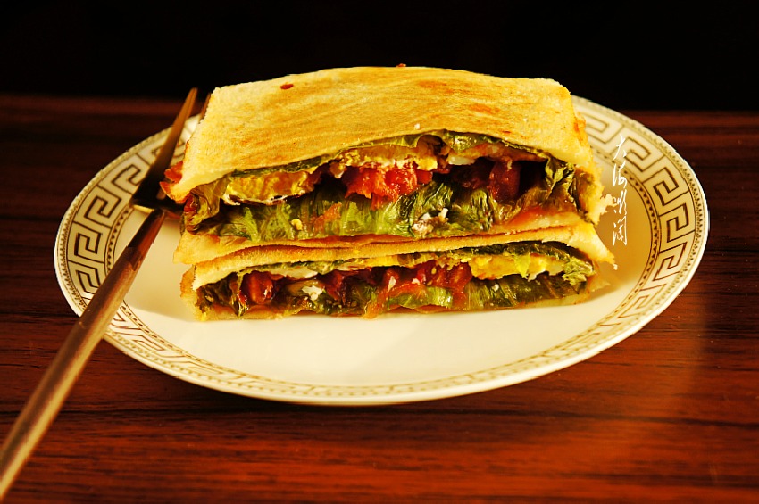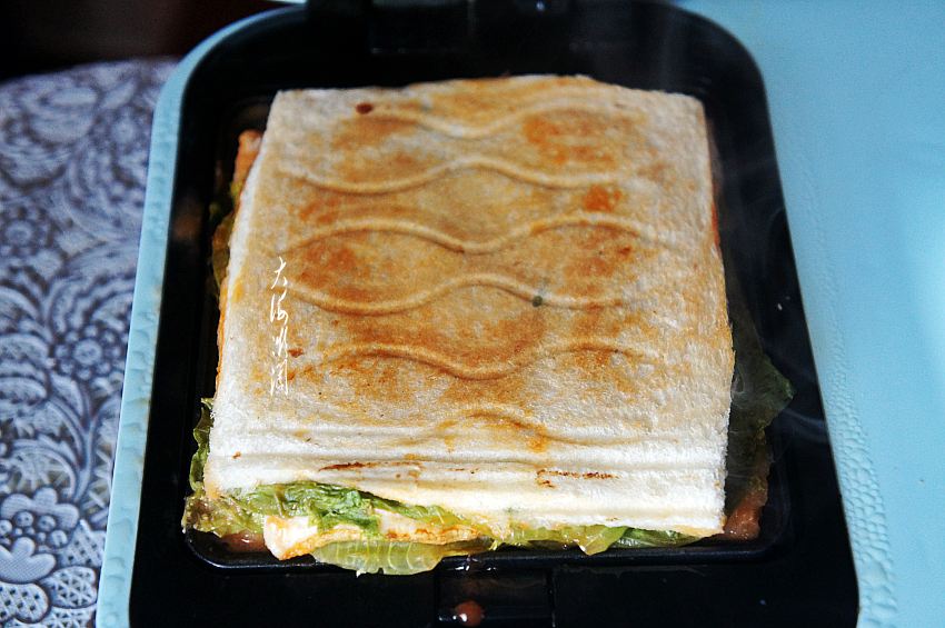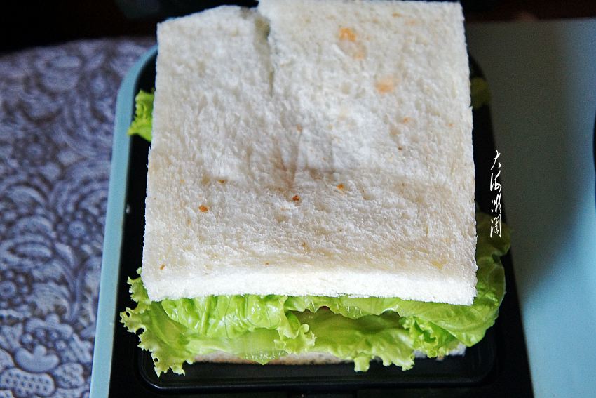 将生菜叶的边边收回来,再码入一片吐司片,然后送入三明治机,启动电源,根据自己喜欢的口感,时间设置3~5分钟即可。