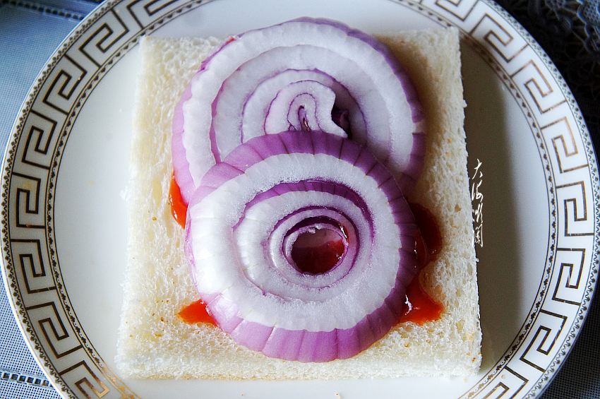 【鸡蛋三明治】所需食材:吐司2片,鸡蛋1个,生菜叶2片,西红柿2片,洋葱2片,沙拉酱适量;番茄酱适量。