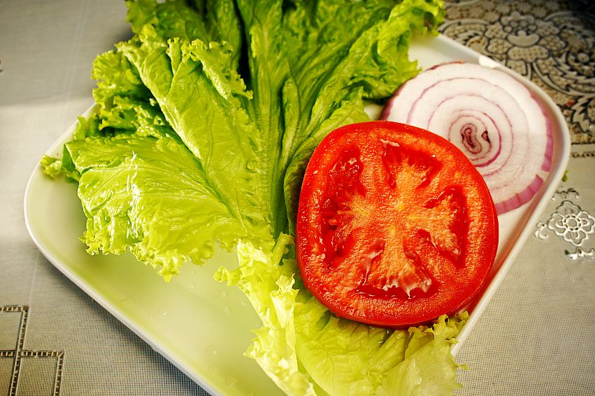 生菜叶和西红柿洗净,在淡盐水中浸泡10分钟,然后再反复清洗干净,起到杀菌的作用。洋葱去皮洗净,横切2片,西红柿也横切2片。