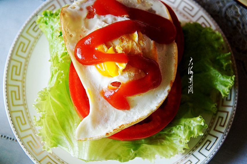 放上一片生菜叶,再挤入沙拉酱,加两片西红柿,码入煎好的鸡蛋,再挤入番茄酱。没有沙拉酱可以换成番茄酱,都好吃。
