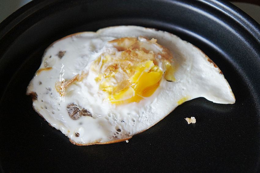 三明治机的不粘锅,不用加油,直接磕入鸡蛋,小火慢煎。这一步可以在洗菜之前就开始操作,其他食材准备好了,鸡蛋也煎好了。