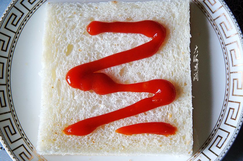 取一片面包片,挤入番茄酱,根据自己喜欢的口感,可多可少。