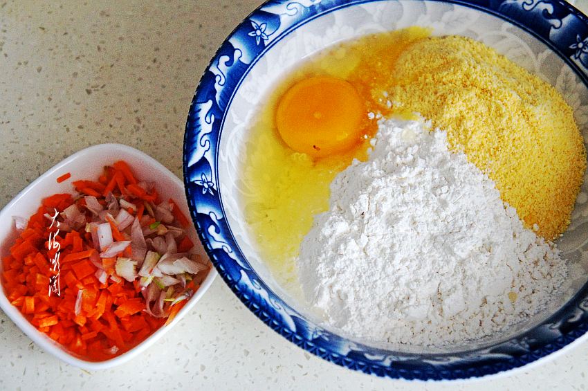 胡萝卜切成细小的丁,毛葱去皮洗净,同样切成细小的丁,取大一点的容器,放入所有准备好的食材。