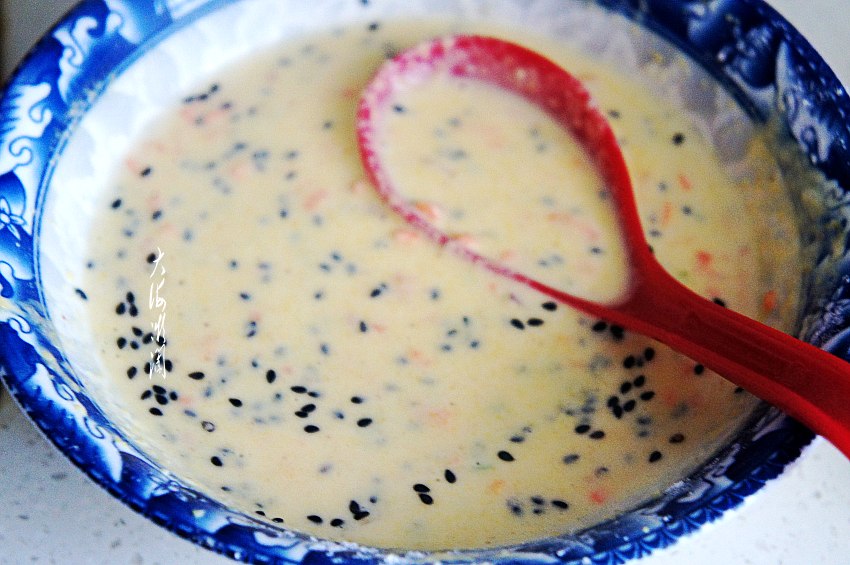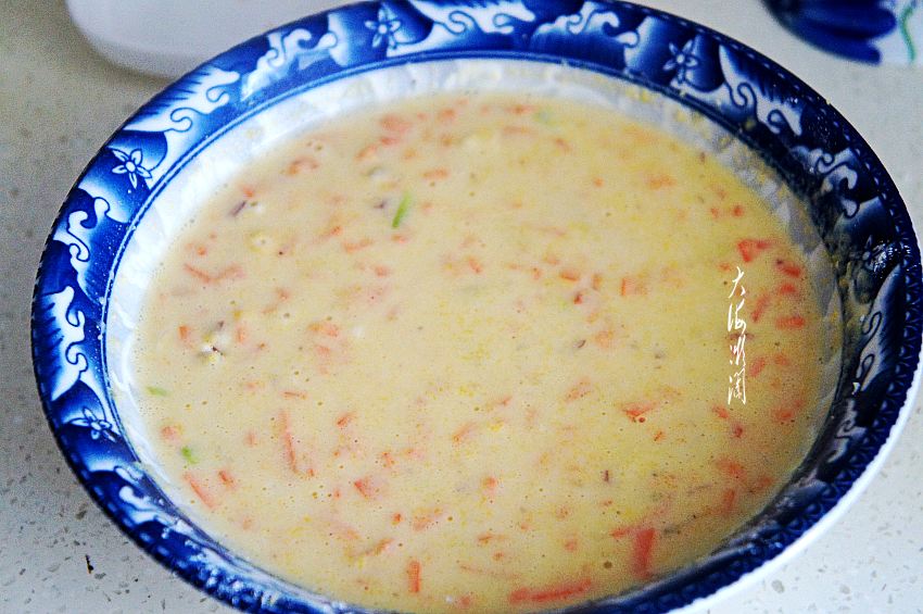 加入适量的水或者牛奶,少许盐、胡椒粉搅拌均匀,稀一点干一点都没关系,稀点饼薄,干点饼厚,就这个差别。