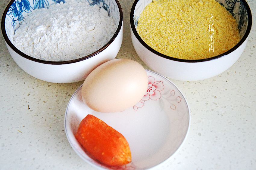 准备食材,玉米面和面粉的比例可以是2:1,也可以是1:1,随自己喜欢的口感而定。胡萝卜去皮洗净。