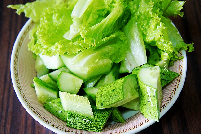 黄瓜纵向一分为四,然后斜切丁,生菜清洗干净,手撕成小块。