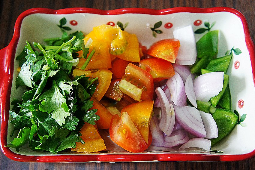 清洗干净的青椒切丁,黄、红西红柿切小块,洋葱切小块,这道菜洋葱不能少,特别提味,有它和没它确实不一样哈。香菜清洗干净切碎,不喜欢香菜味道的亲们可以不放。