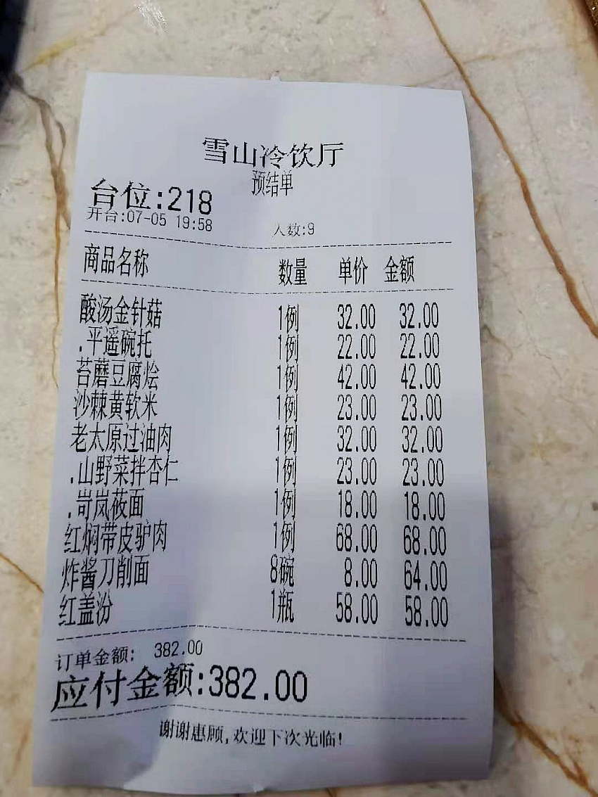 夏日炎炎,宅家不如挑选一个好去处,开启一场清凉之旅,现在这季节山西还是不错的选择,温度不高,这一周都在30度以内,早晚凉爽,看好时机,同学群里一呼,没想到居然有9人立马响应,从准备到出发也不过三五天就成行了,分别来自哈尔滨、西安、南京、北京的9名同学,自驾两台车,昨天晚上聚在太原,太原第一餐吃点啥,当然是山西有名的小吃了,我们逛了整条美食街,少许品尝一点小吃后,就找一家餐厅聚餐了,9人8菜1汤加上刀削面,合计消费382元,你说贵不贵,话不多说,上菜。