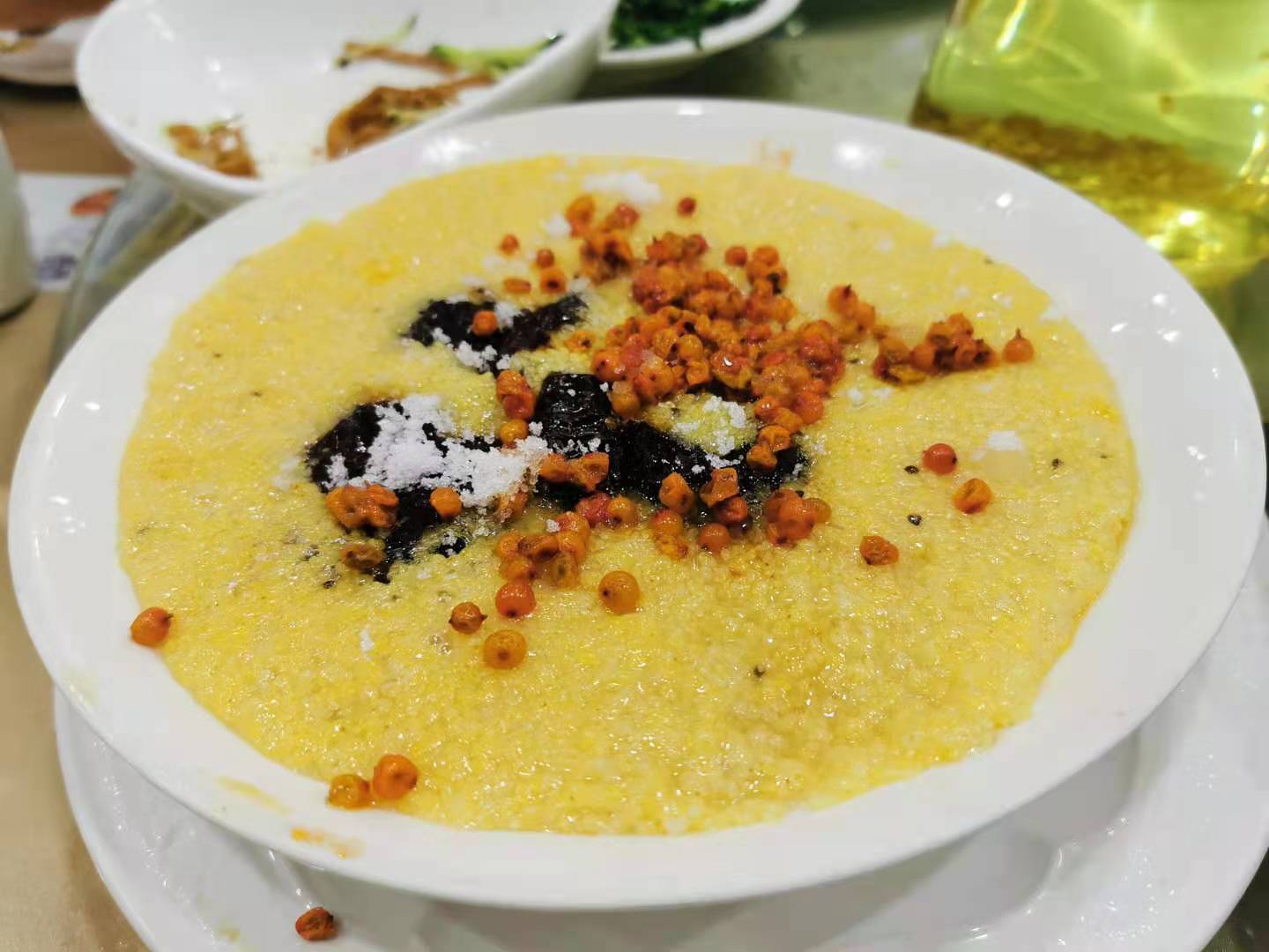 原来黄软米就是东北的大黄米,我还是第一次这样吃,就是黄米粥上边撒点沙棘、枣泥和白糖,味道蛮好吃的,酸甜口味,即可当菜也可当主食,比较简单的特色菜肴。