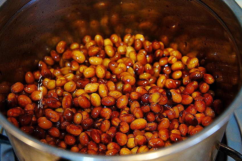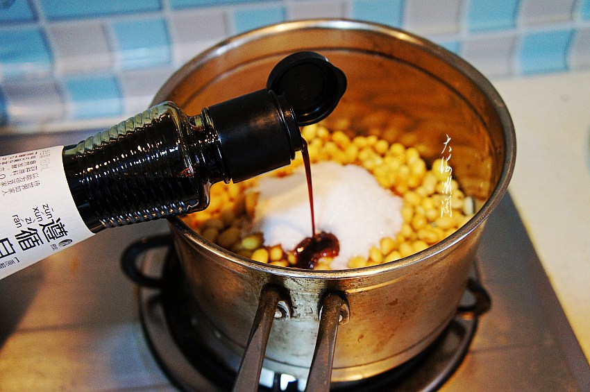 煮好的黄豆捞出放入汤锅中,加入适量的白糖,可以依据个人喜欢的口味添加,酱油加到与黄豆齐平就好。
