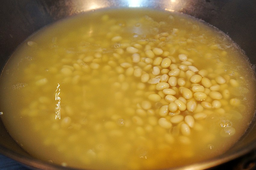 锅中加入适量的水,浸泡好的黄豆冷水下锅,然后大火煮开,小火慢煮,至黄豆煮熟。