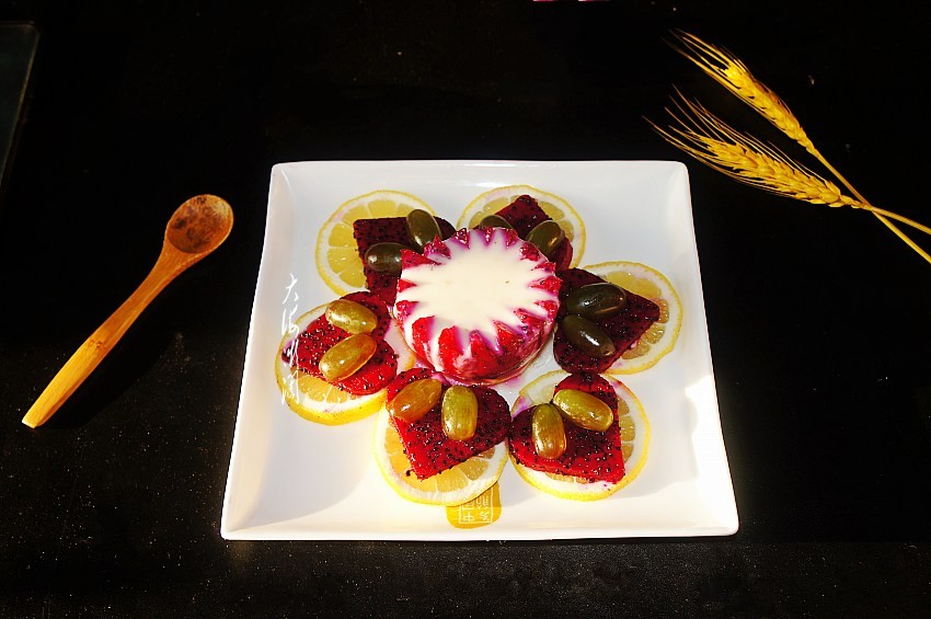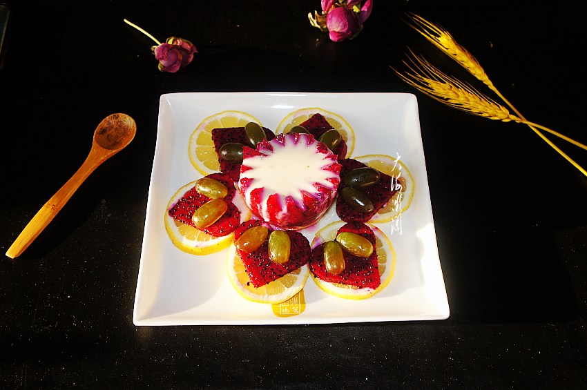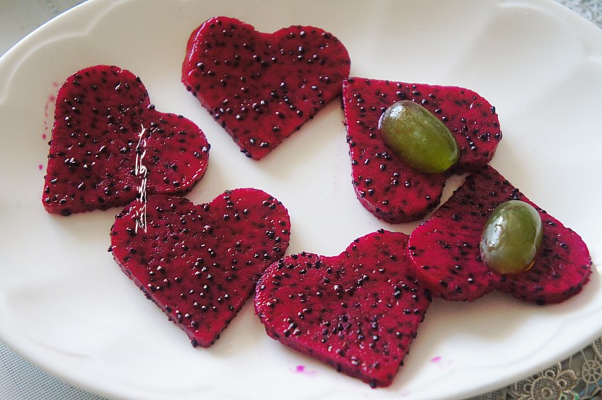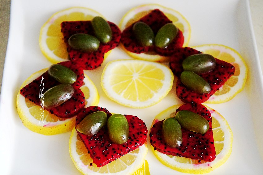 另取一个火龙果,去皮切片,用模具造型,我选择的是心形,可以按照自己的想法造型。然后把心形火龙果片码在柠檬片的的上边,中间少许加点白糖(减肥人士可以不加),因为柠檬比较酸,火龙果也不是很甜,加点糖增甜减酸。糖是人体不可少的营养素,它对促进儿童生长发育关系很大。白糖还有清热、消炎、降火气的作用。