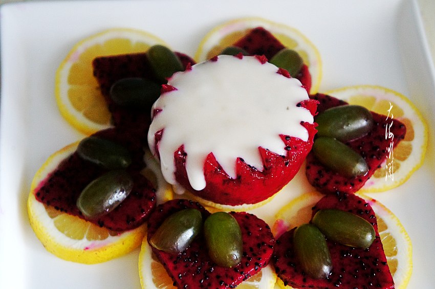 将去皮的火龙果放在盘中间,少许加点糖,然后倒入冠利凯撒沙拉酱,倒满为止。不喜欢沙拉酱的小伙伴可以换成酸奶,也是非常美味的。