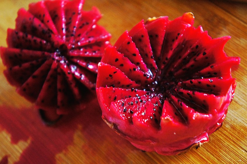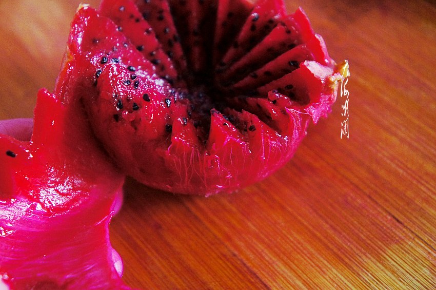 一切准备就绪,再把挖好的火龙果去皮,注意动作要轻一点不要碰破火龙果的外形。