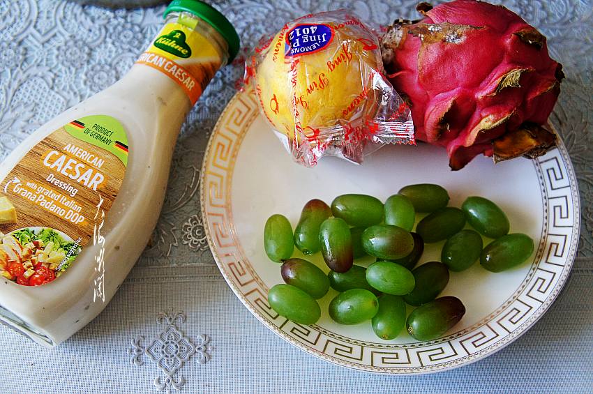 【水果沙拉】所需食材:火龙果2个;柠檬1个;葡萄粒适量;白糖适量;冠利凯撒沙拉酱适量。