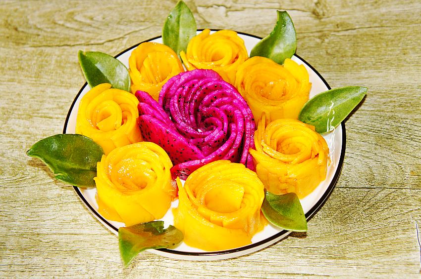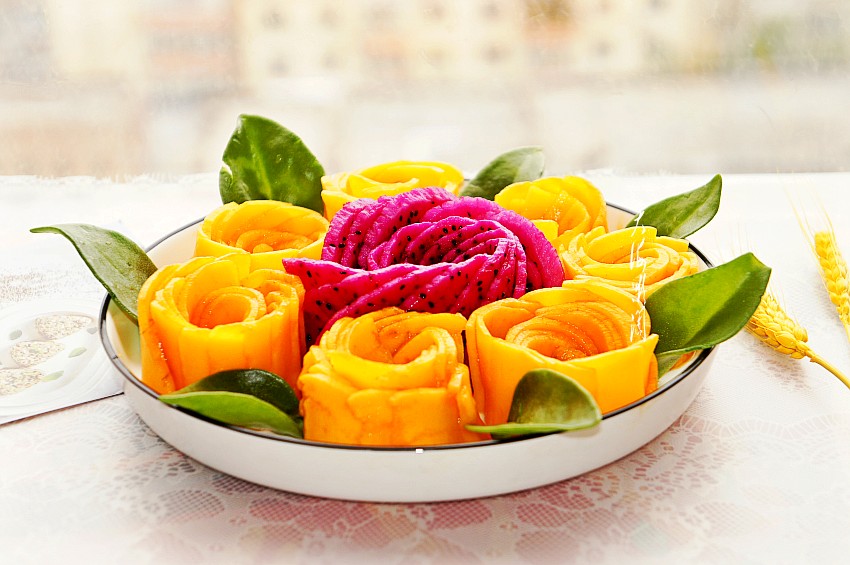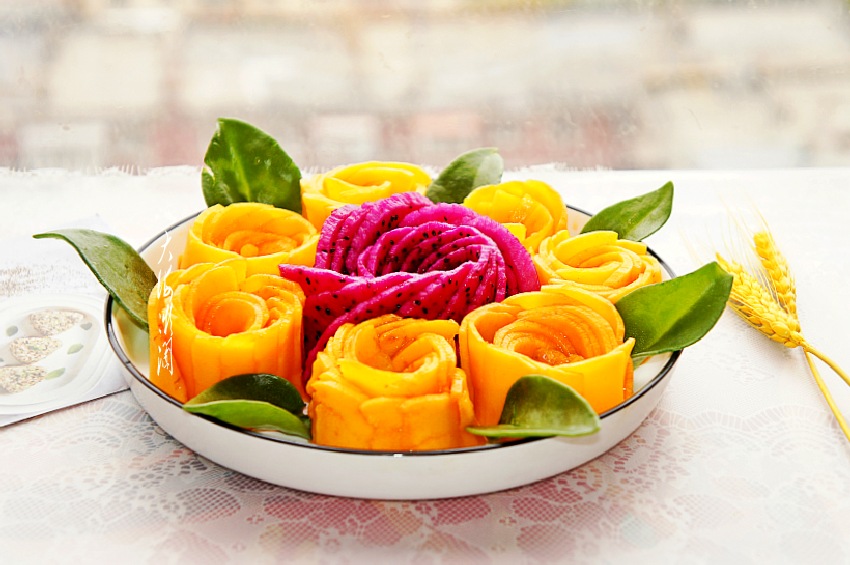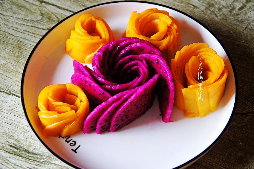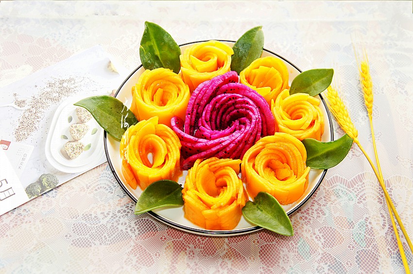 切好的芒果片分别做成小玫瑰花形状,码在火龙果玫瑰花的周边,这颜色搭配看着就有食欲吧!