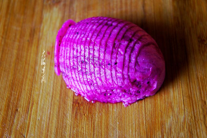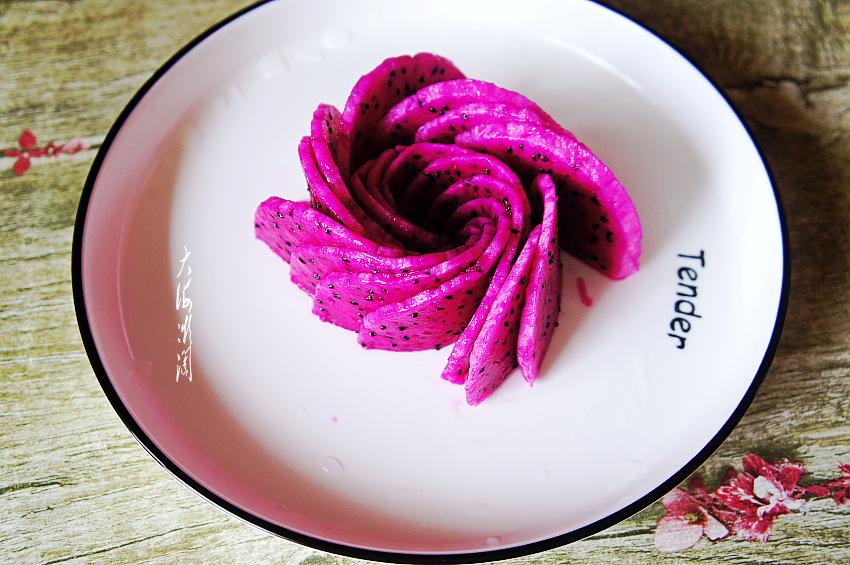 将火龙果片做成玫瑰花的造型,然后码在盘中,很简单吧!
