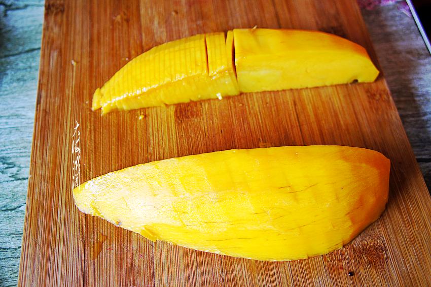 芒果去皮去弧,分成4份,同样的方法均匀地切成薄片。芒果营养价值很高,且果肉细腻,素有“热带果王”之美誉,芒果的糖类及维生素含量非常丰富,尤其维生素A原含量占水果之首位,具有明目的作用。除此之外芒果还有美肤、健脑、减肥的功效。