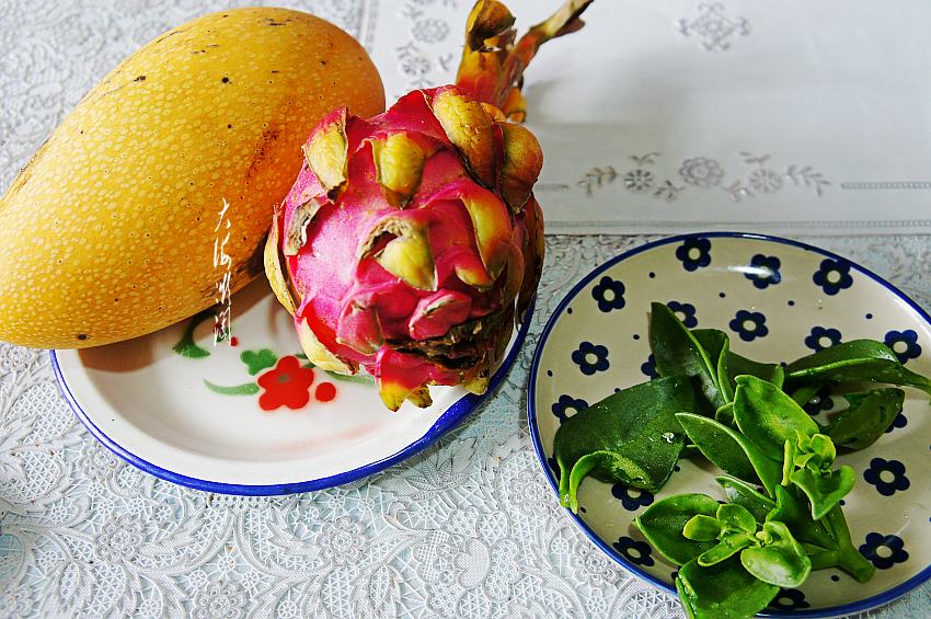 【缤纷果盘】所需食材:芒果1个;红心火龙果1个;穿心莲适量。