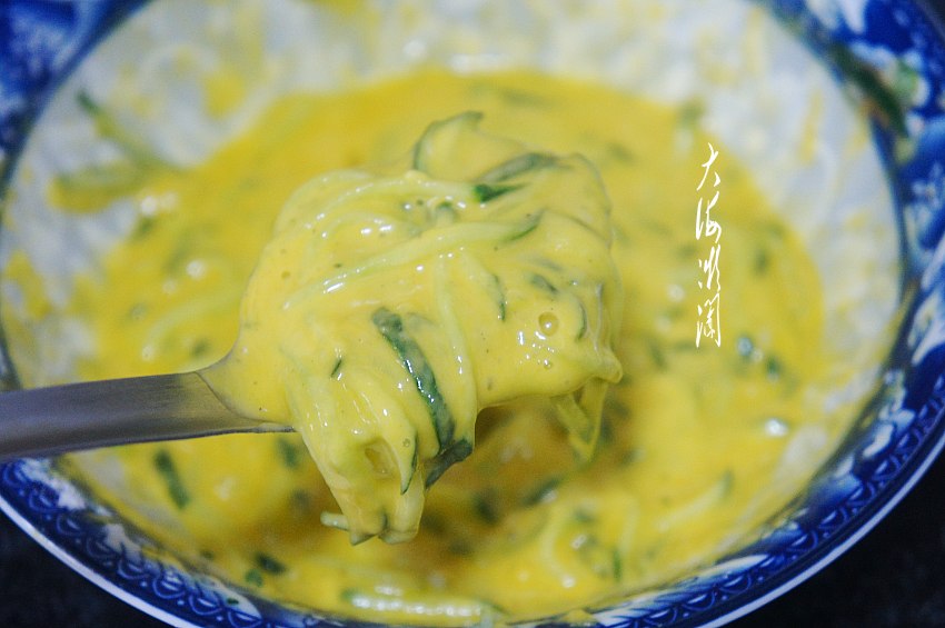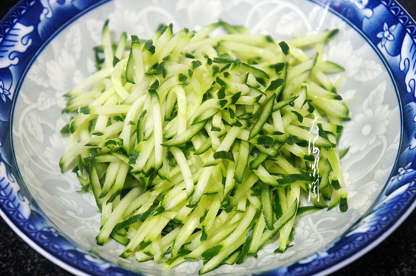 黄瓜洗净,自家种植的黄瓜无农药无化肥,无需去皮,也不用在淡盐水中浸泡,直接洗净就好了,然后用擦丝器擦丝。