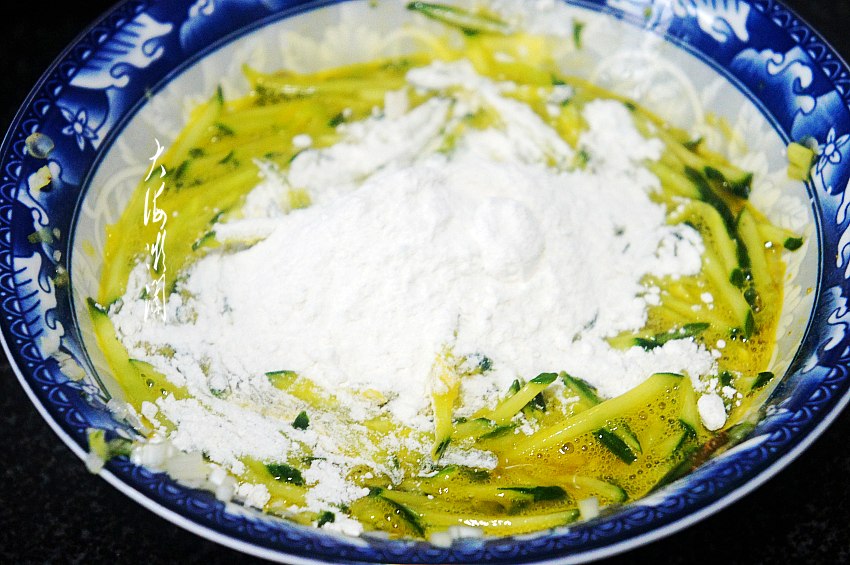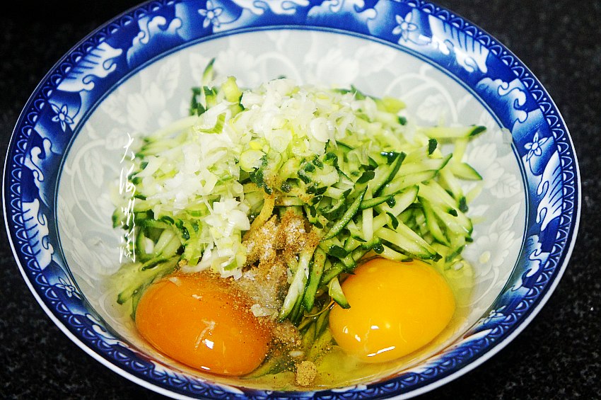 小葱去皮洗净切碎,加入到黄瓜丝中,磕入2个鸡蛋,加入盐、五香粉、胡椒粉搅拌均匀。
