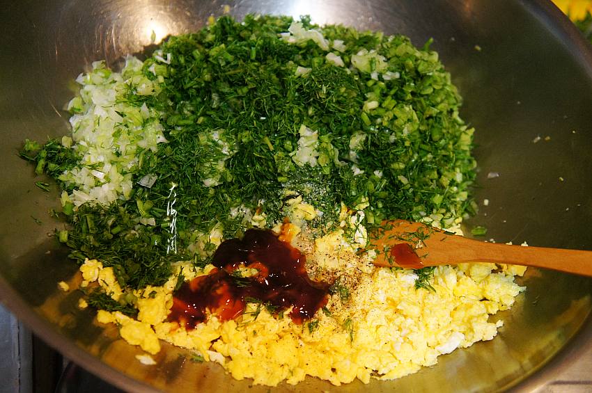 食材:面粉300g;香菜1把;鸡蛋3个;油、盐、料酒、葱、五香粉、蘑菇粉各适量。
