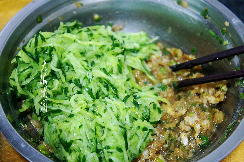 3、黄瓜洗净,擦成丝,撒上适量的盐,腌制10分钟,然后攥掉水分,加入到肉馅中,搅拌均匀。香菜洗净切碎,加入到黄瓜馅中搅拌均匀,加上香菜,味道就是不一样。