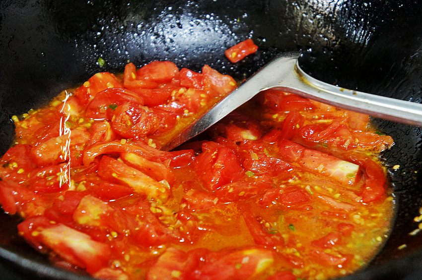 炒锅加入适量的橄榄油,橄榄油有极佳的天然保健功效,对于老年人和儿童来说经常食用是非常有益处的。爆香葱姜,下入西红柿翻炒,炒至汤汁浓郁,这季节的西红柿汤汁很多,无需加水,可以加入一勺番茄酱,我没加,感觉刚刚好。