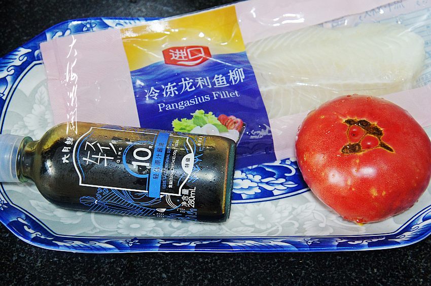 准备食材,准备一个大西红柿,或者换成两个小西红柿,洗净备用。买回来的冷冻龙利鱼解冻。