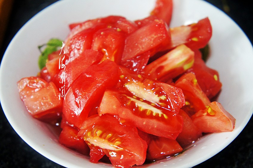 洗净的西红柿表面切十字花刀,放入开水中烫一下,然后去掉西红柿皮,切块。这是姐家自家种植的西红柿,自然熟透,汤汁浓郁,原汁原味。