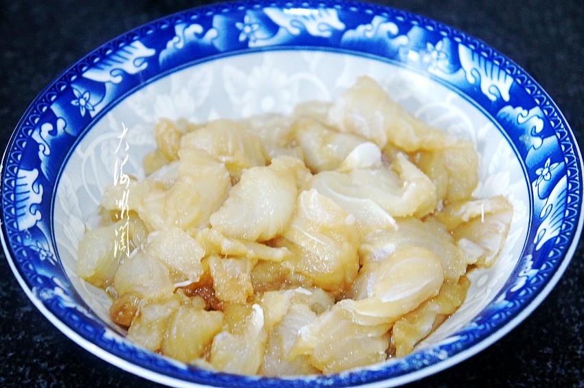 用刀片成薄片,加入料酒、六月鲜10克轻盐原汁酱油、玉米淀粉拌匀,腌制10分钟左右。