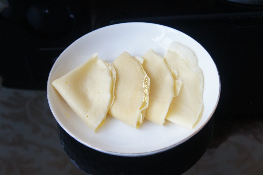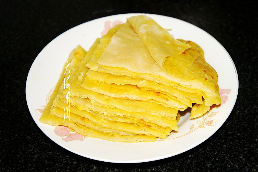 6、出锅装盘,注意及时地扣上盖子或者装入食品袋,防止干边,因为饼薄。