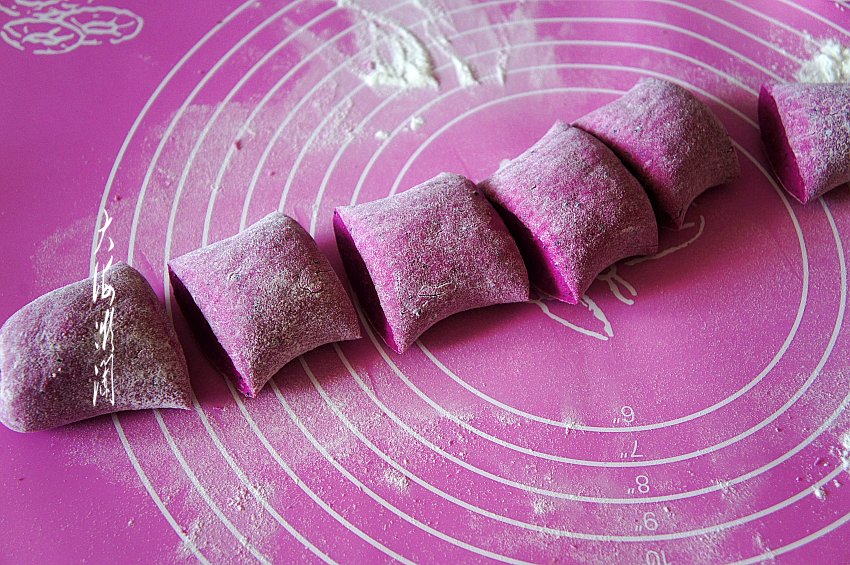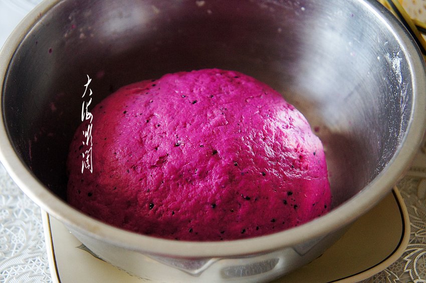 火龙果汁不用过滤,火龙果籽更有营养。面粉中加入火龙果汁、酵母和成面团,盖上保鲜膜温暖处饧发大约1小时。或者送入蒸烤箱,40度发酵40分钟左右,或者好可以在锅中加入适量的水,加热至30~40度,不烫手为好,将面团盆放在上边,会加快发酵速度,发酵至2倍大即可。