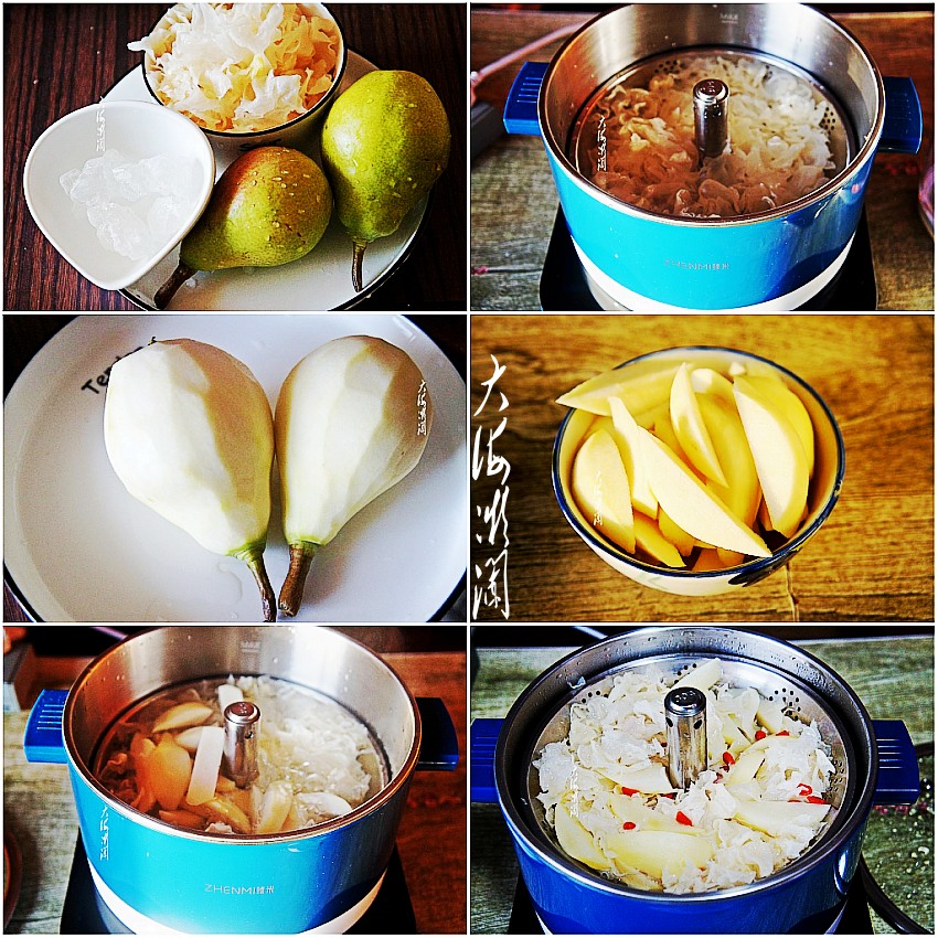 食材:银耳1把;雪梨2个;冰糖适量;枸杞子适量。