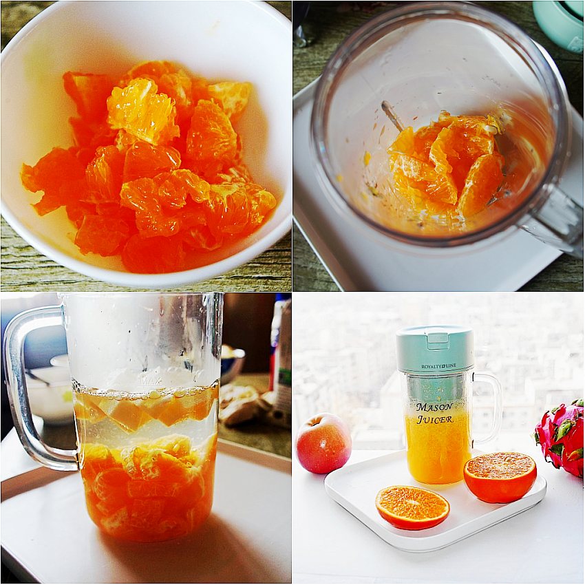 做法:橙子去皮去籽,切成1.5cm大小的块,果肉放入榨汁杯中,再加入200mL的凉白开水,拧紧主机盖,看到有绿灯显示,然后连击两下启动电源,倒置榨汁机开始工作45秒就OK了,橙汁非常细腻,感觉不到有筋膜,比买的橙汁好喝多了,还是自己动手榨汁吧,随时随地,好吃又健康。