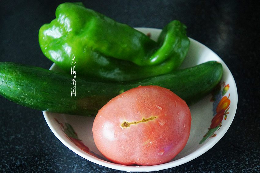 准备食材,西红柿、黄瓜、青椒洗净,这些食材都来自自家小菜园,无农药无化肥,纯绿色有机蔬菜,脆嫩多汁。