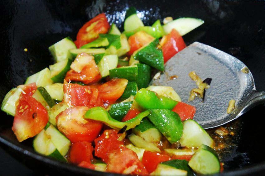 下入黄瓜翻炒,黄瓜水分很大,炒这菜不用加水,蔬菜自身的汤汁足矣。