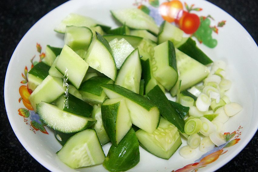 黄瓜切块,别切片,炒出来口感不好,葱去皮洗净切碎。