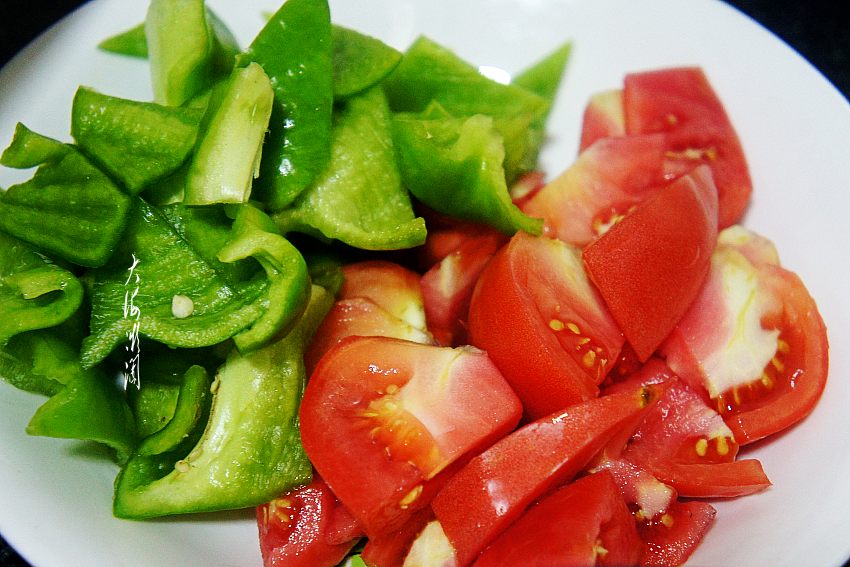 青椒、西红柿分别切块,西红柿也可以去皮的。
