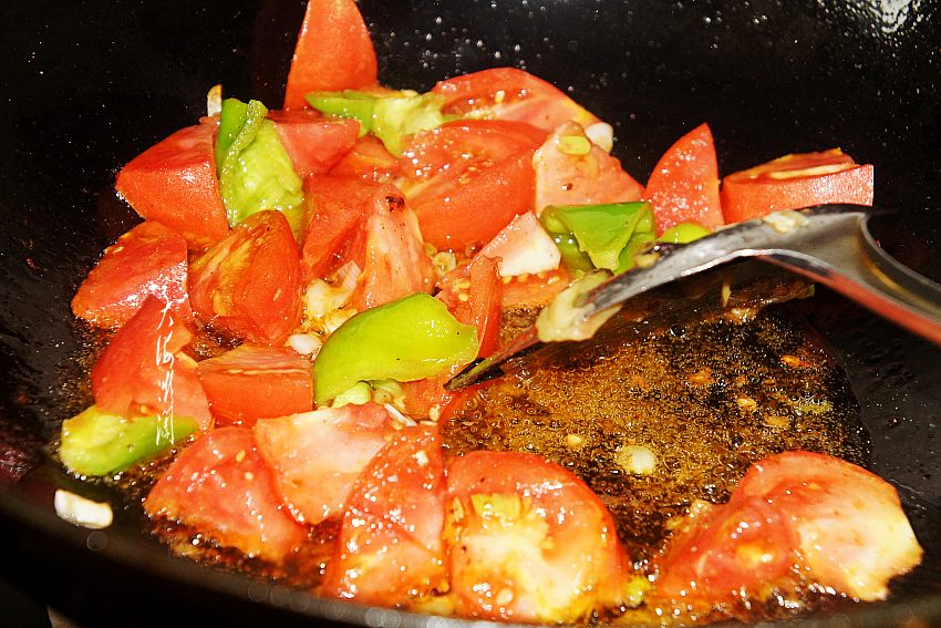 炒锅加入适量的油,爆香葱花,下入西红柿翻炒,炒至西红柿出汤汁。